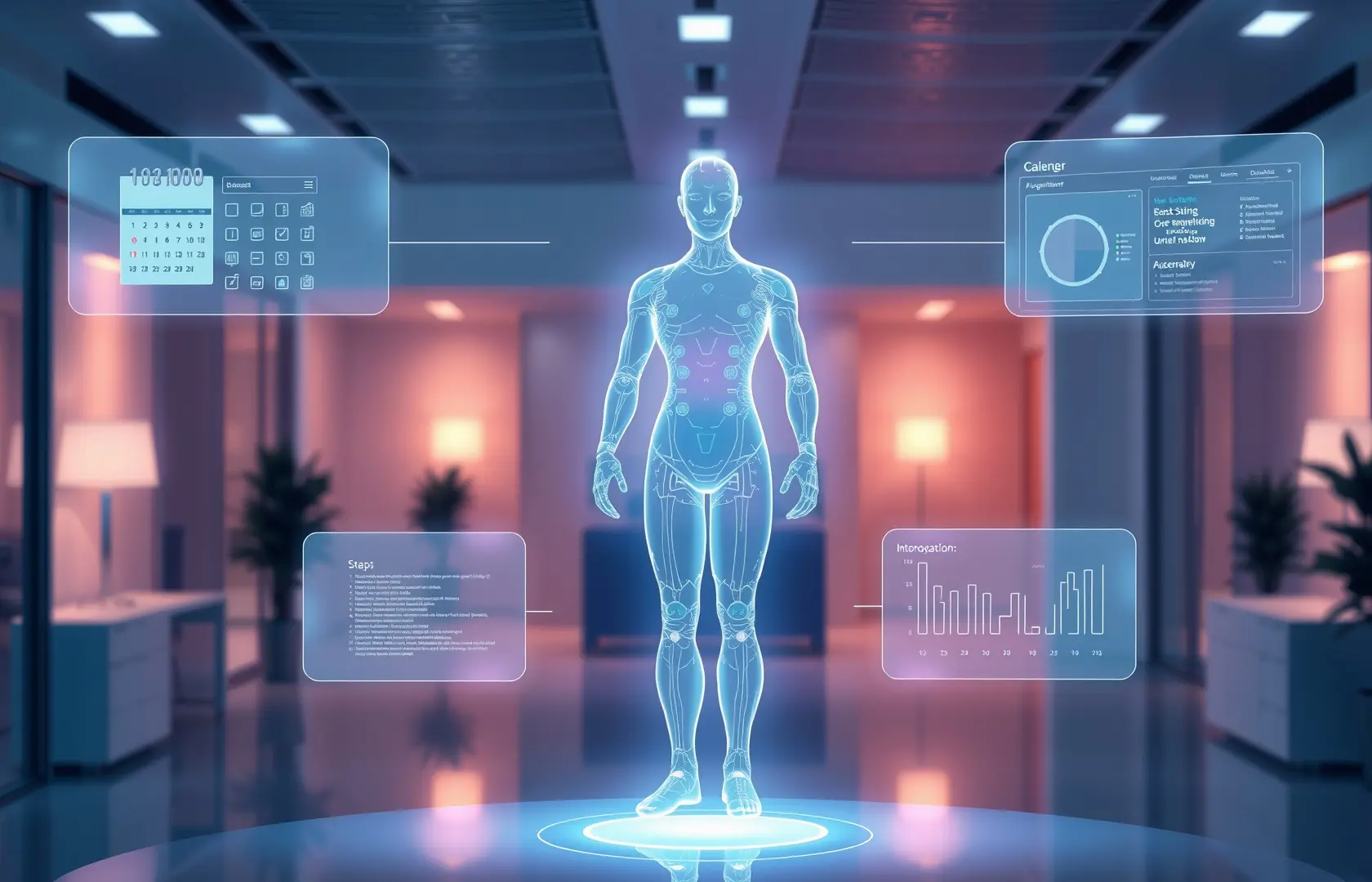 Professional visualization of an autonomous AI agent performing tasks with holographic digital interfaces and data panels.